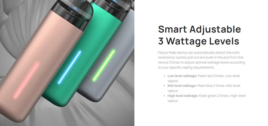 El dispositivo Flexus Peak detecta automáticamente la resistencia y ajusta los niveles de potencia óptimos según tus necesidades de vapeo. Indicadores LED muestran el nivel de potencia: rojo para bajo, azul para medio, verde para alto.