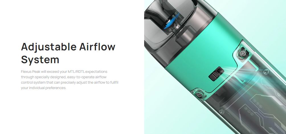 El Flexus Peak superará tus expectativas MTL/RDTL a través de un sistema de control de flujo de aire fácil de usar que ajusta precisamente el flujo de aire según tus preferencias individuales.