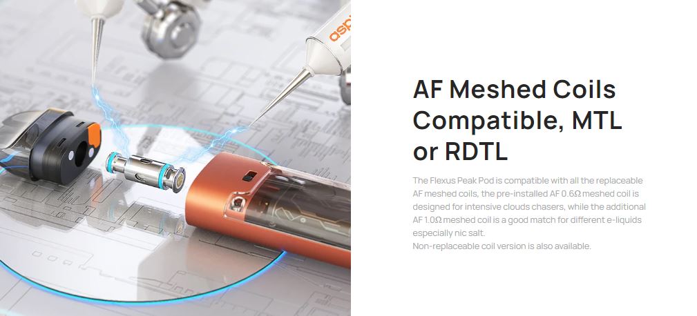 El pod Flexus Peak es compatible con todas las resistencias AF reemplazables. La bobina AF 0.6Ω está preinstalada para las nubes intensas, mientras que la resistencia adicional AF 1.0Ω es ideal para diferentes líquidos, especialmente sales de nicotina.