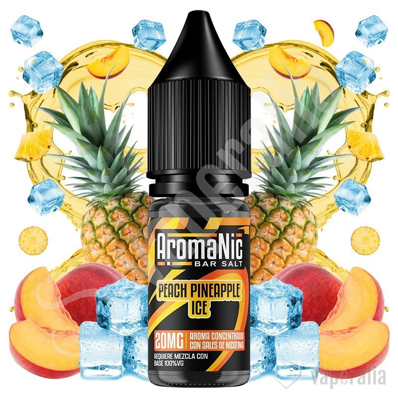 El aroma Peach Pineapple Ice de AromaNic combina la piña madura y jugosa despliega su dulzor exótico, acompañado por la suavidad de los melocotones en su punto óptimo de maduración, culminados con un golpe refrescante que realza cada matiz.