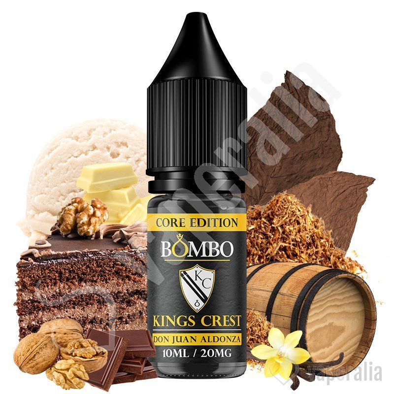 El líquido Don Juan Aldonza de Kings Crest Core Edition Salts & Bombo Core Edition fusiona Don Juan Reserve y Aldonza Reserva: una tarta de chocolate con galletas graham, mantequilla de nueces pecanas y crema batida, junto a unas finas notas de tabaco con vainilla envejecido en barrica de roble americano.