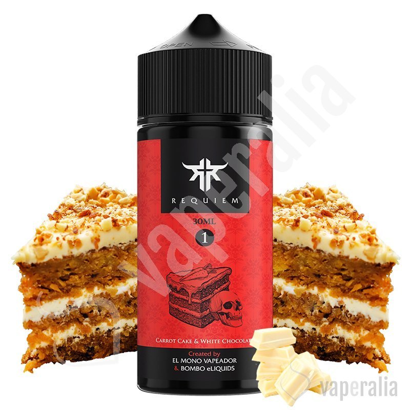 El aroma Requiem 1 de El Mono Vapeador & Bombo en formato Longfill, sabe a tarta de zanahoria con una sedosa capa de crema de queso Mascarpone con virutas de frutos secos, que envuelve un esponjoso bizcocho con zanahoria triturada y relleno de chocolate blanco.