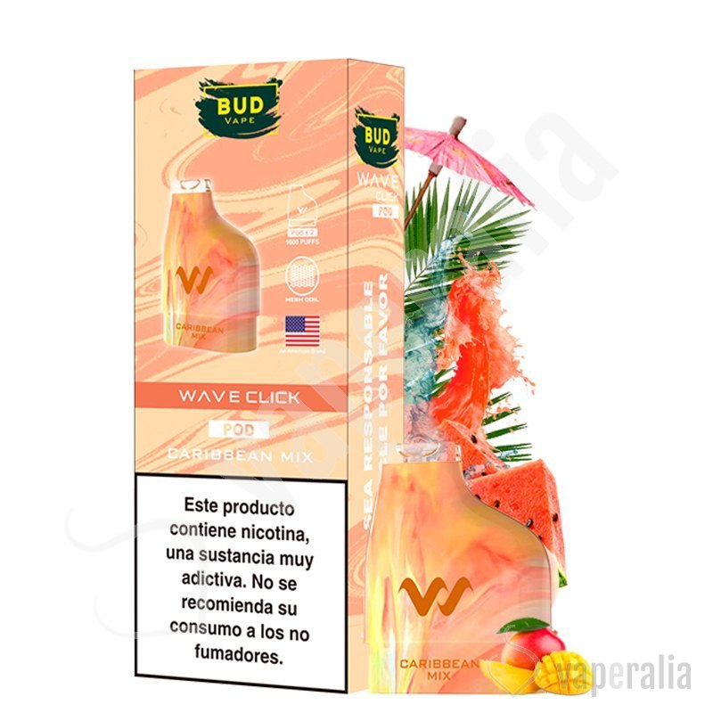 El Pod Wave Click Caribbean Mix de Bud Vape es un pod precargado desechable, con tecnología Wavetech y un acabado acristalado con inyección de resina. Ofrece el sabor de una intensa mezcla de mango, melocotón y deliciosa sandía.