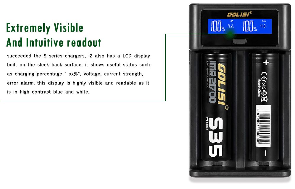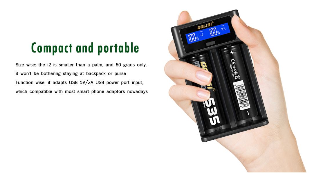 El cargador i2 de Golisi es un cargador muy compacto y potente, que utiliza un puerto de alimentación USB. Es ideal pra baterías clíndricas de 32 a 70mm y su uso es muy sencillo gracias a una pantalla LCD que muestra a tiempo real información sobre el estado de carga, la corriente y el voltaje. Además, sus resortes de carga y placas deslizantes están fabricados con acero inoxidable de grado militar para soportar gran uso.