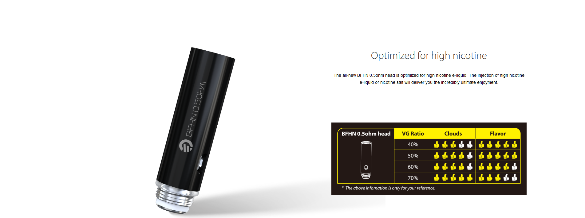 Las nuevas resistencias BFHN de 0.5 ohm están optimizadas para altas cantidades de nicotina. La dosis de nicotina o de sales de nicotina te proporcionará una experiencia satisfactoria.