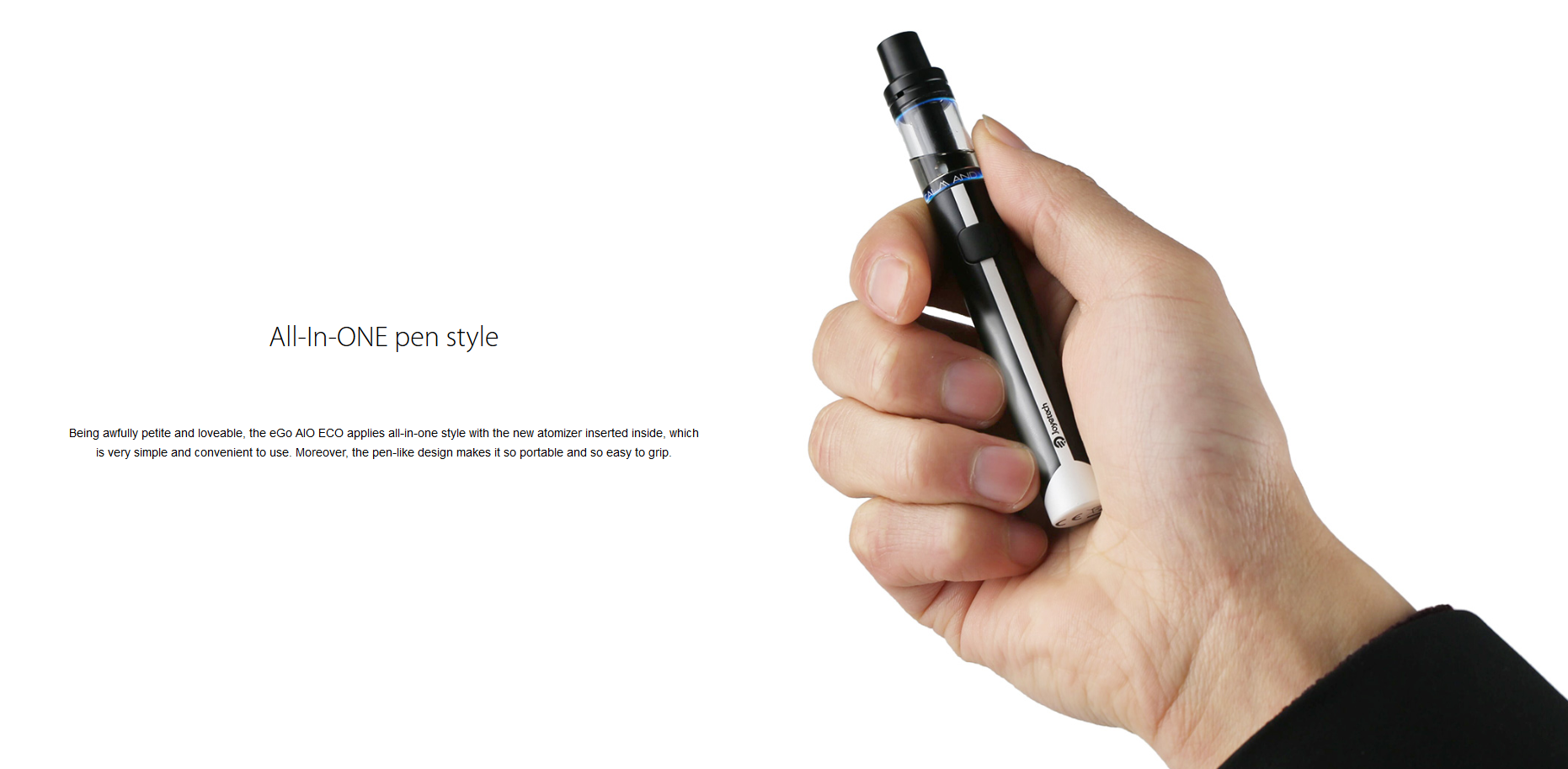 Siendo pequeño, el EGO AIO ECO inserta un nuevo atomizador en su interior, muy simple y cómodo de usar. Además el diseño tipo bolígrafo lo hace muy portátil y sencillo de sujetar.