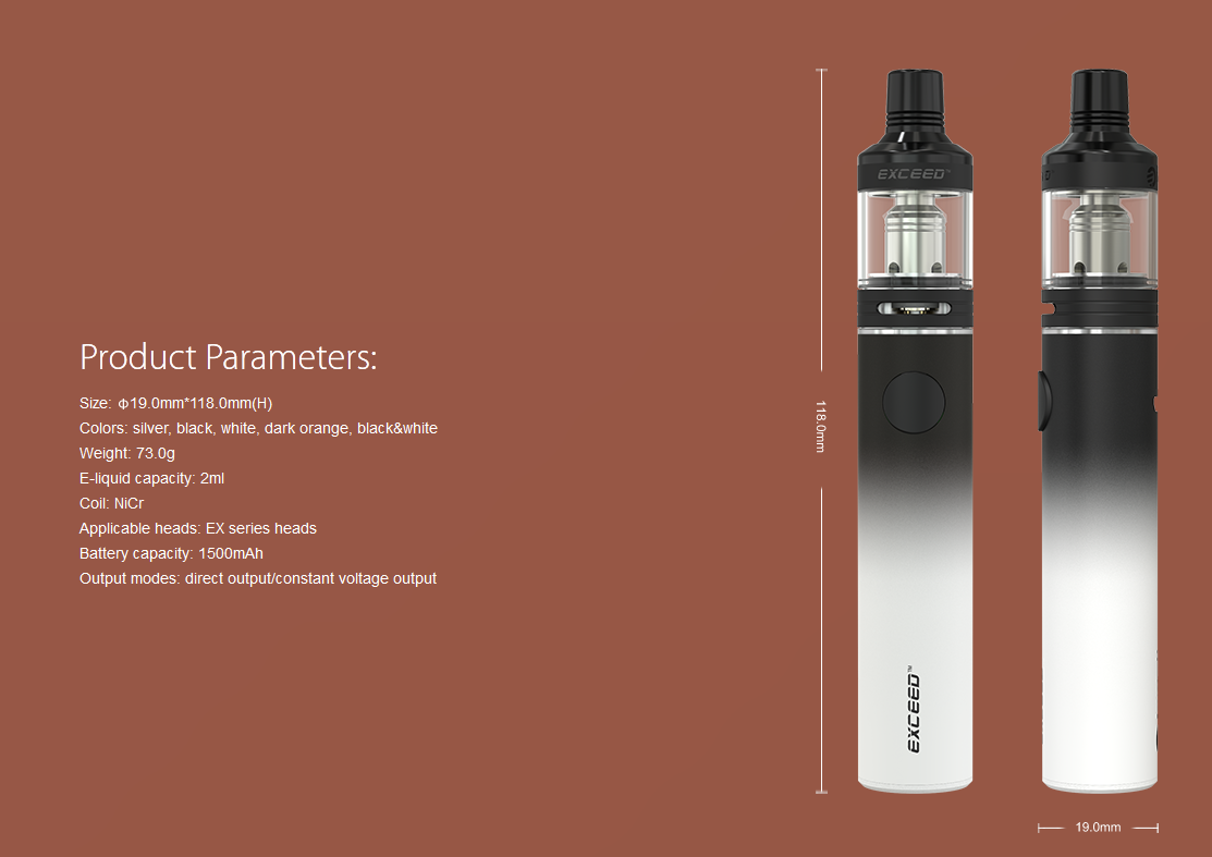 EXCEED D19 starter kit, al ser un vaporizador compacto y elegante pero también eficiente en todos los aspectos, presenta dos modos opcionales: salida directa y salida de voltaje constante junto con protección avanzada de doble circuito. El atomizador EXCEED D19 adopta un sistema de llenado de líquido cómodo y fácil junto a un control de flujo de aire ajustable. Los nuevos cabezales de la serie EX con diseños novedosos están diseñados para proporcionar un sabor puro con una gran experiencia de vapeo, sin importar para boca a pulmón o pulmón directo. Su simplicidad hace un vapeo más fácil y agradable.