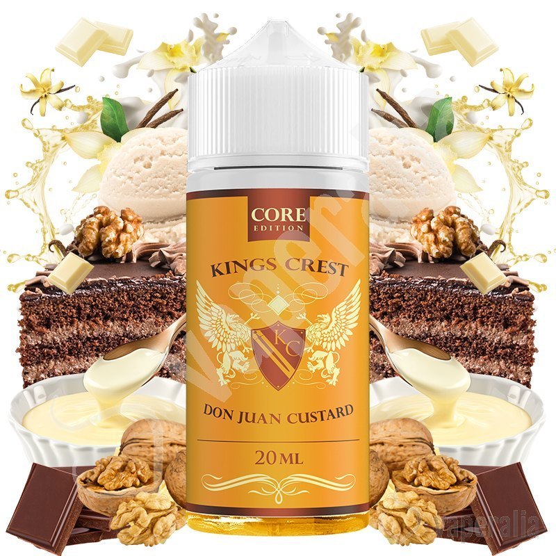 El aroma Don Juan Custard de Kings Crest Core Edition en formato Longfill, sorprende por su sabor a tarta de chocolate cubierta con mantequilla de nueces pecanas, crema batida y además, ¡con un toque de natilla casera! Una combinación irresistible en tu paladar.