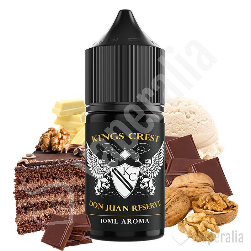 El aroma MiniLongfill Don Juan Reserve de Kings Crest sorprende por su sabor a tarta de chocolate recubierta con mantequilla de nueces pecán y crema batida. ¡Ideal para vapear diariamente!