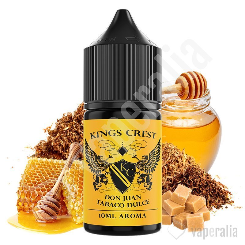El aroma Don Juan Tabaco Dulce de Kings Crest tiene un sabor muy adictivo con su combinación de tabaco puro y un toque dulce a miel. Características:Botella Chubby Gorilla de 30 ml Tapón a prueba de niños Dilución: 30% Maceración: 21 díasAdvertencia: este producto es un aroma y debe diluirse con PG, VG o VPG según sea su preferencia.