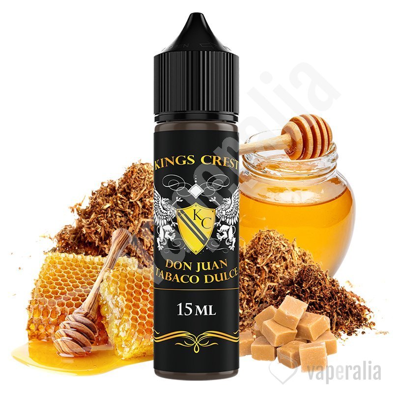 El aroma Don Juan Tabaco Dulce de Kings Crest en formato Longfill, suena tan exquisito como adictivo, ya que combina tabaco con un toque dulce de miel.