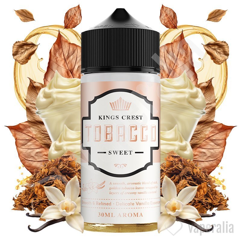 El aroma Tobacco Sweet de Kings Crest en formato Longfill, es una mezcla suave de tabaco con crema de vainilla. Más dulce y cremoso, que puede llegar a recordar a un postre. Ideal para los que prefieren sabores más golosos.