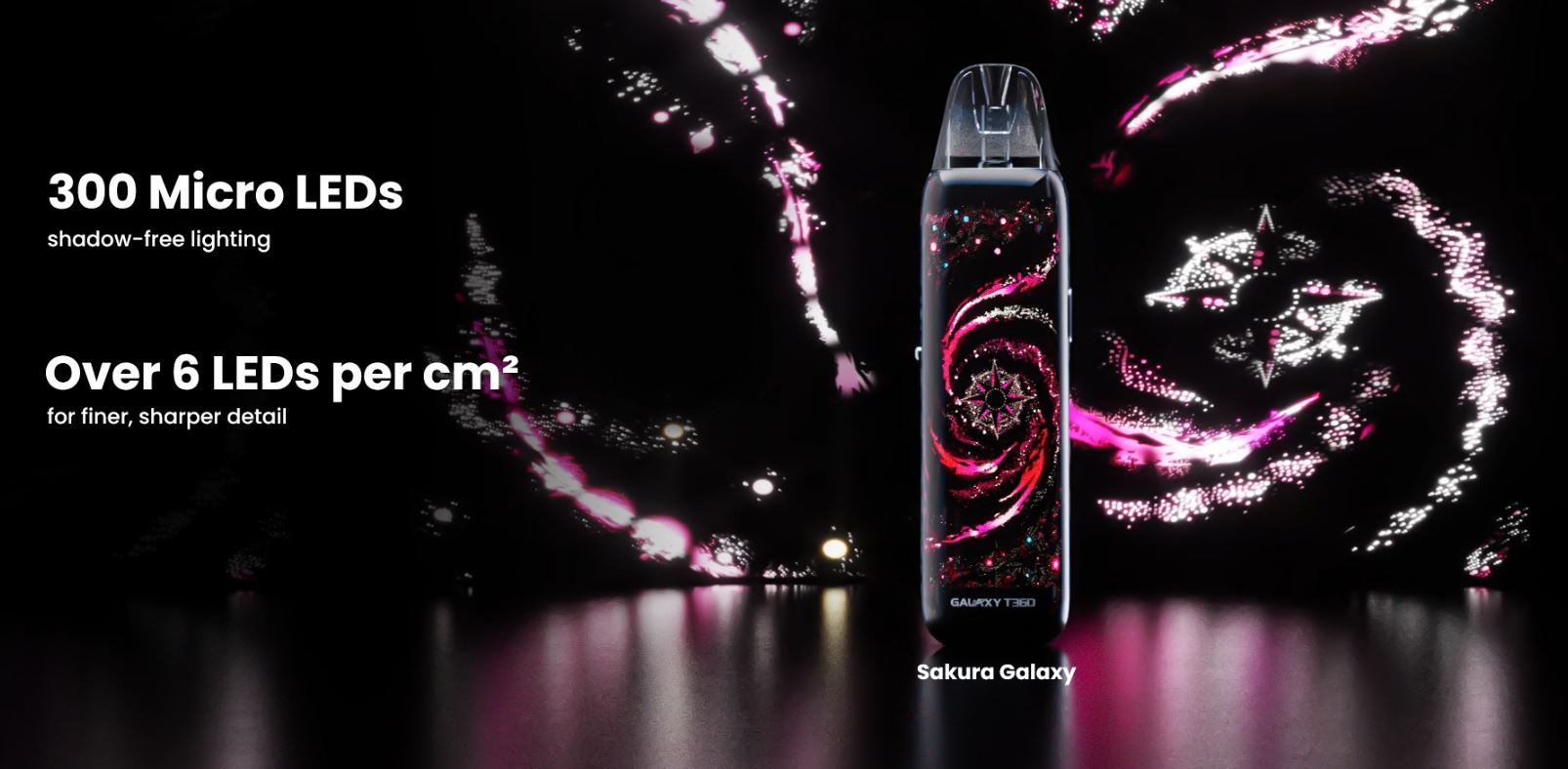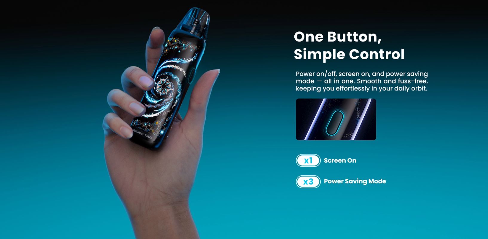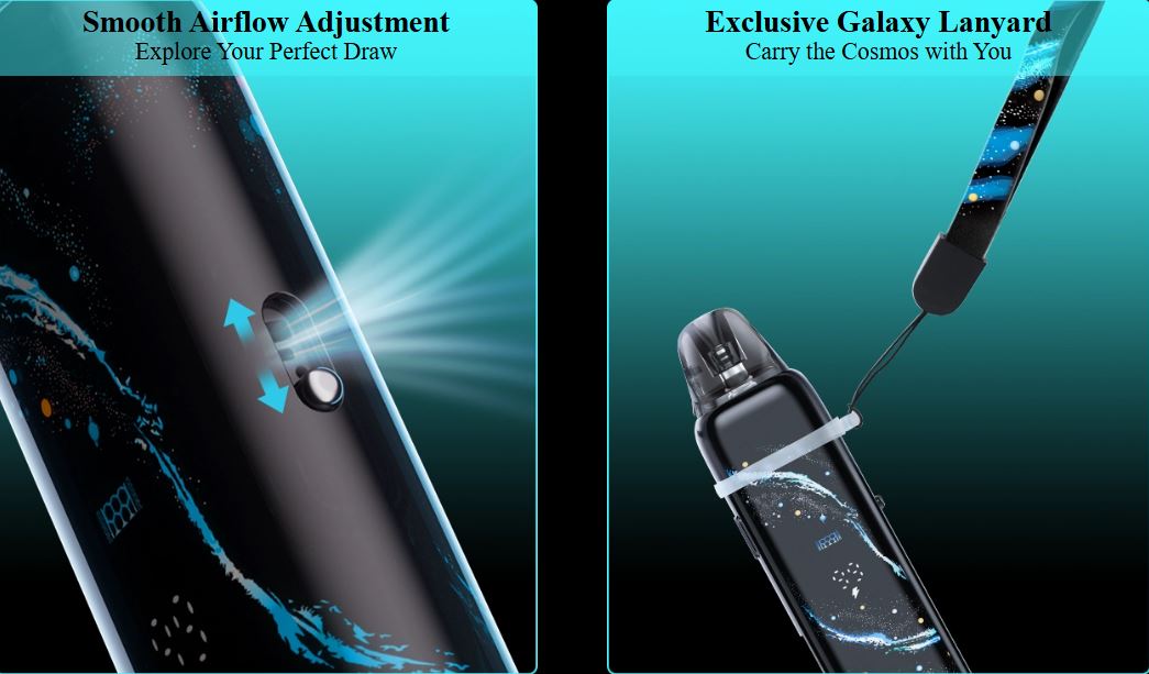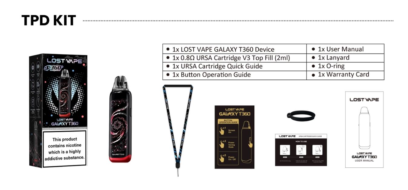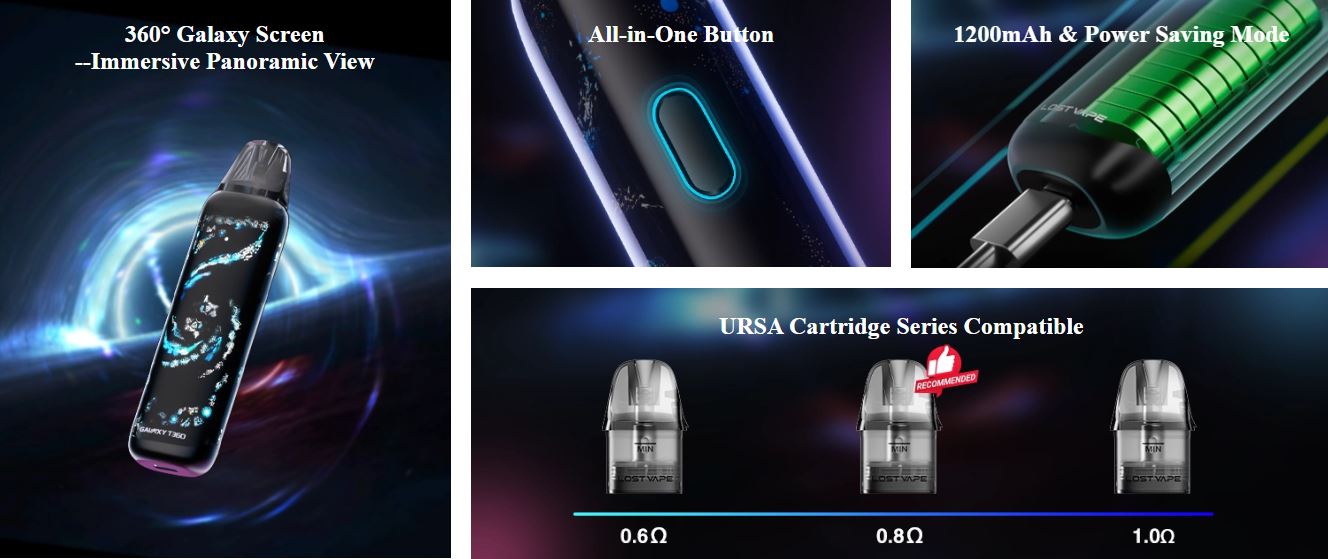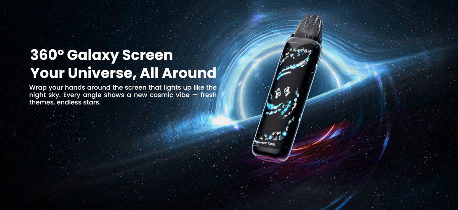 El dispositivo Galaxy T360, no pasará desapercibido con su fondo de pantalla, el cual recrea una galaxia con una imagen de 360º. Es compatible con los cartuchos URSA, cuenta con una salida de aire ajustable, un rango de potencia de 5-35W, 1200mAh de batería interna, y un botón para que puedas configurarlo según tus preferencias. ¡Agarra el cosmos con tu mano!