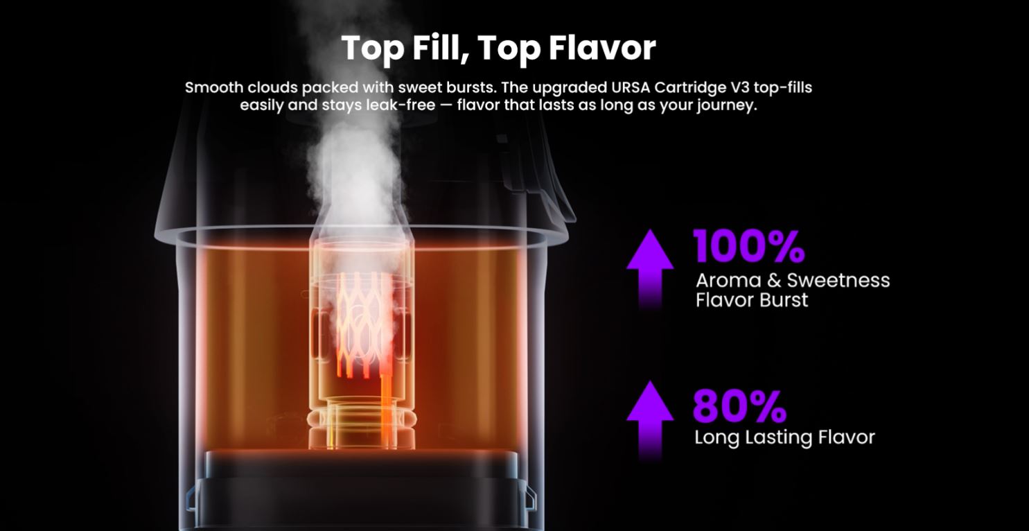 Con el cartucho URSA V3 top fill, mantén el sabor constante y duradero.