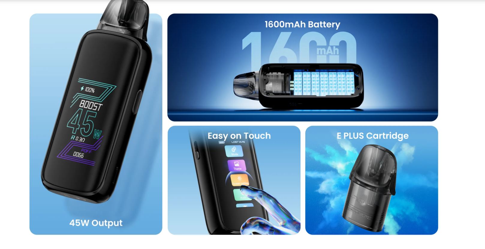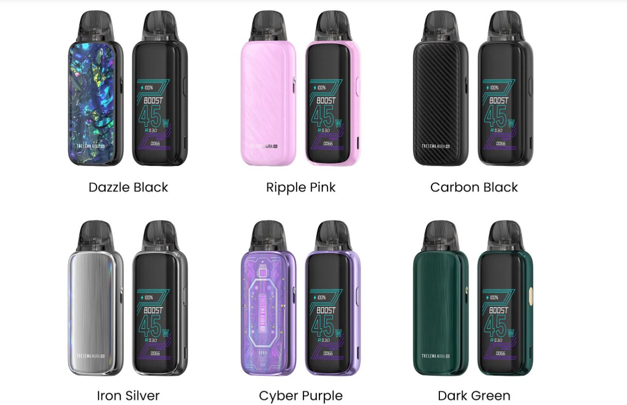 El Thelema Aura 45 es un dispositivo tipo pod, con una potente batería integrada de 1600mAh y hasta 45W, ideal para aquellos usuarios que buscan un uso diario. Ofrece dos modos: ECO y Boost, flujo de aire ajustable, compatibilidad con los cartuchos E-Plus. Incluye una pantalla táctil y carga rápida para que tu experiencia sea personalizable.