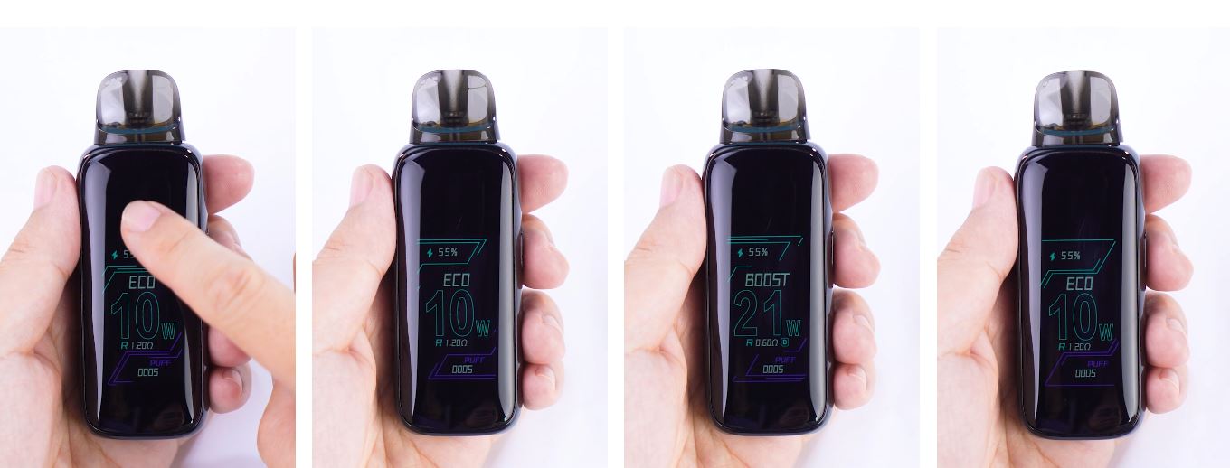 Con el Thelema Aura 45 sólo necesitarás 4 gestos para dominar tu dispositivo: Desliza hacia abajo para el menú, al lado contrario para volver, doble click para ajustar los wattios y de forma lateral con doble click, para cambiar el modo de Eco a Boost.