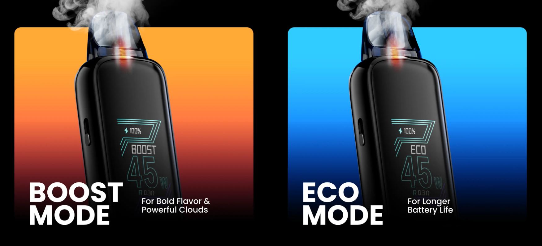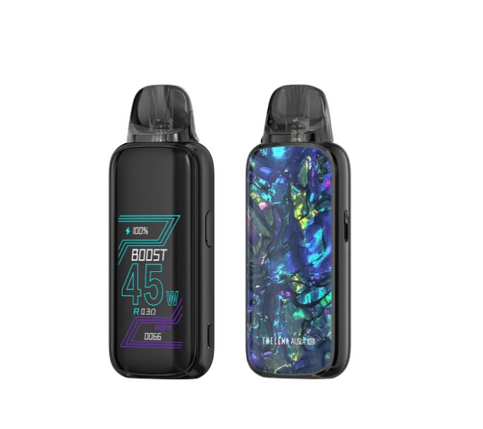 El Thelema Aura 45 cuenta con dos modos: Boost Mode para sabores atrevidos y potentes y nubes potentes, mientras que el Eco Mode está pensado para alargar la batería del dispositivo.