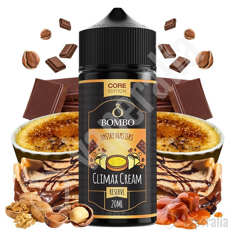 El aroma Climax Cream de Pastry Masters by Bombo Core Edition en formato Longfill, sabe a crepe de crema catalana con pepitas de chocolate, frutos secos y notas acarameladas. Una receta con doble proceso de maceración, que está destinada a ser el “buque insignia” de los postres.