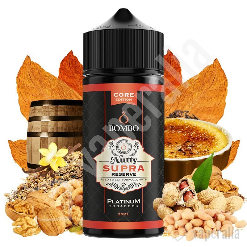 El aroma Nutty Supra Reserve en formato Longfill de Platinum Tobaccos by Bombo Core Edition es una variación de Supra (Mejor Tabaquil en Vapexpo 2022), famoso por su sabor a tabaco dulce con matices acaramelados y tostados, combinado con deliciosa crema de frutos secos.