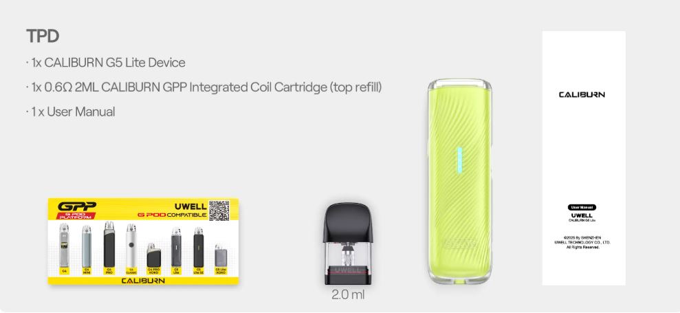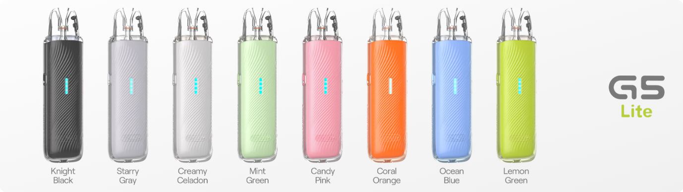 El Caliburn G5 Lite de Uwell presenta una estética atemporal, minimalista y con tonos actuales. Incorpora una batería interna de 1600 mAh, potencia máxima de 35 W y luces RGB que indican el nivel de carga, permitiendo un uso de hasta 6 días sin recargar. Cuenta con una capacidad de 2ml, alto rendimiento y un sistema visual práctico y moderno.