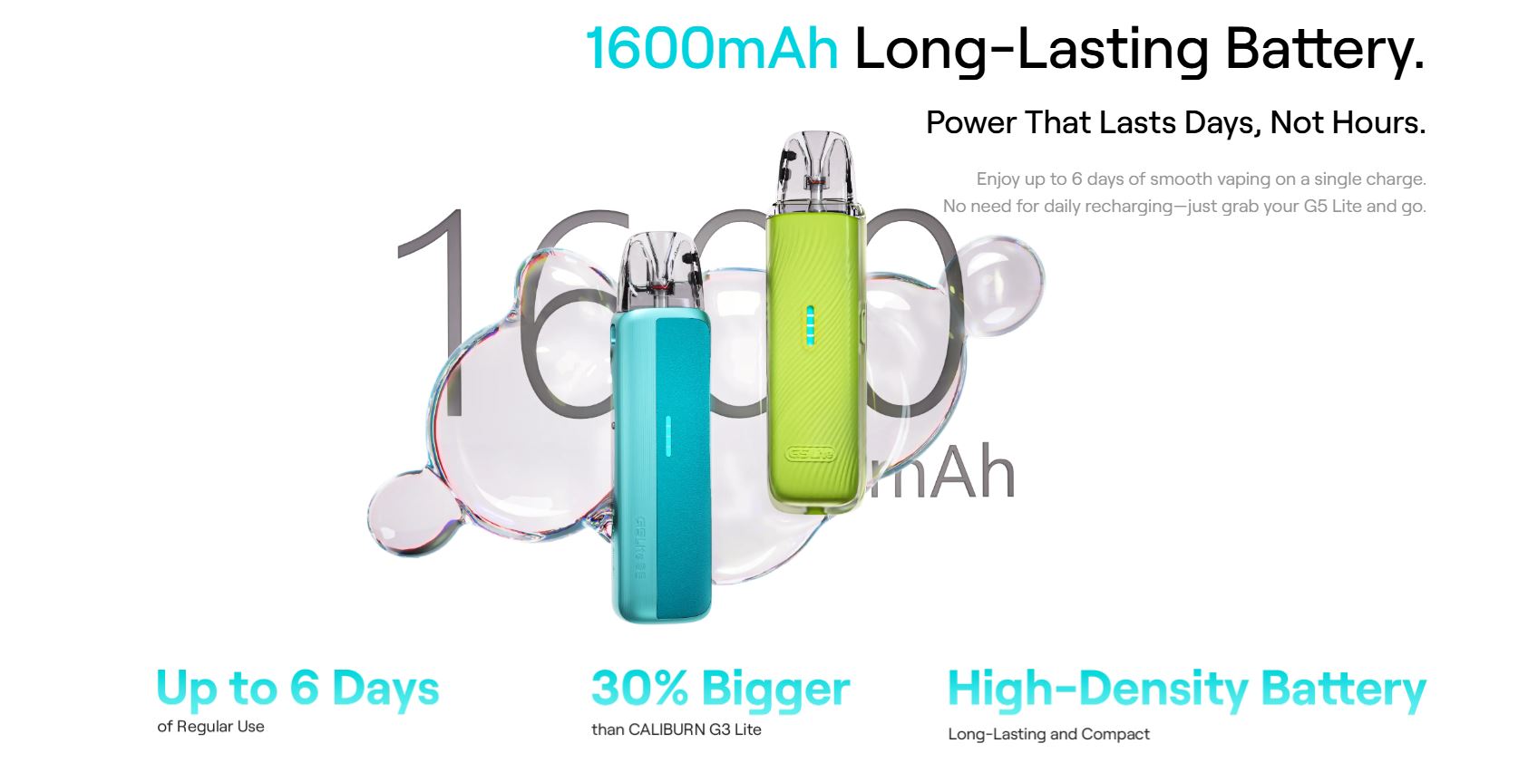 El Caliburn G5 Lite tiene una batería que no sólo dura horas, si no días. Disfruta hasta 6 días del mejor sabor sin necesidad de cargarlo.