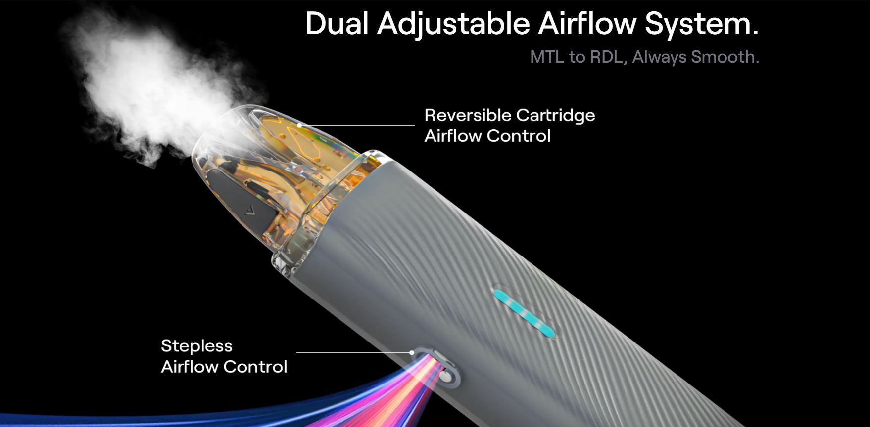 El dispositivo dispone de una salida de flujo de aire laterial para que puedas pasar del MTL al RDL tratando de conservar siempre el sabor más fiel.