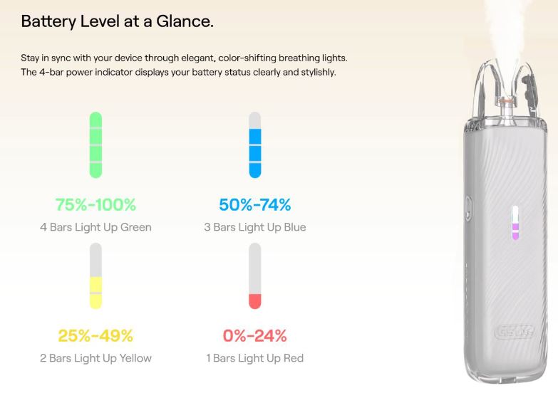 Con el Caliburn G5 Lite podrás mantenerte informado sobre su estado de la batería gracias a su indicador por colores y barras.