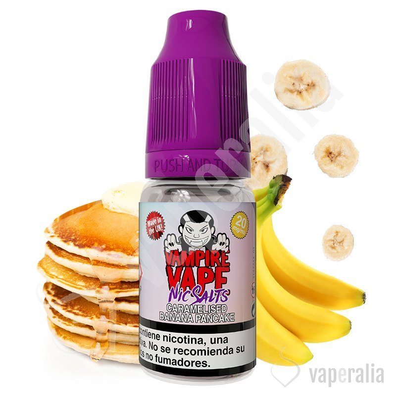 El líquido Caramelised Banana Pancakede Vampire Vape recrea el sabor de las tortitas esponjosas con rodajas de plátano suave, cubiertas con caramelo dulce. Sabor perfecto para cualquier situación.