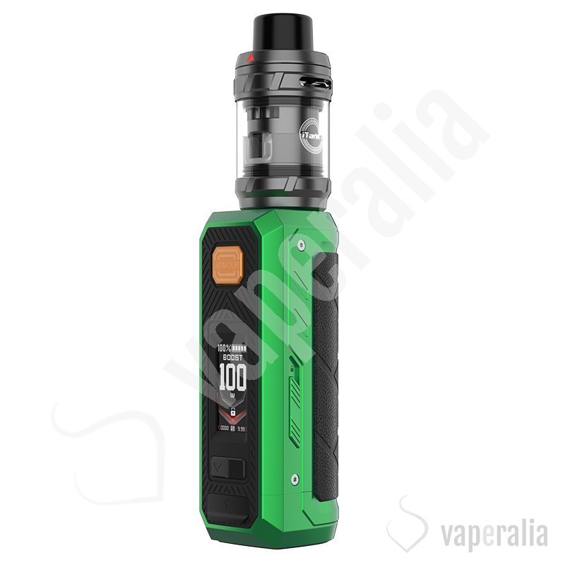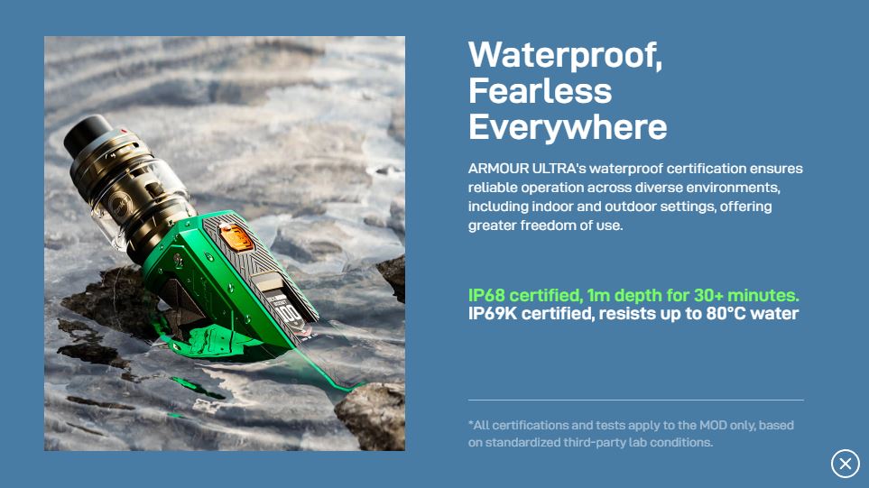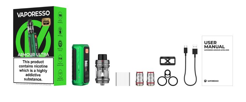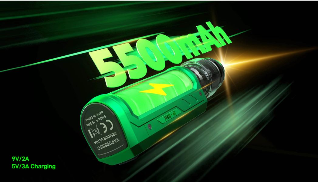 El kit Armour Ultra de Vaporesso cuenta con una potente batería de 5500 mAh que ofrece una duración similar a la de dos baterías 18650. Además, su certificación garantiza una protección total frente al agua, el polvo y las caídas, mientras que la tecnología GTi Dual Mesh con modo Boost proporciona un rendimiento y sabor excepcionales.