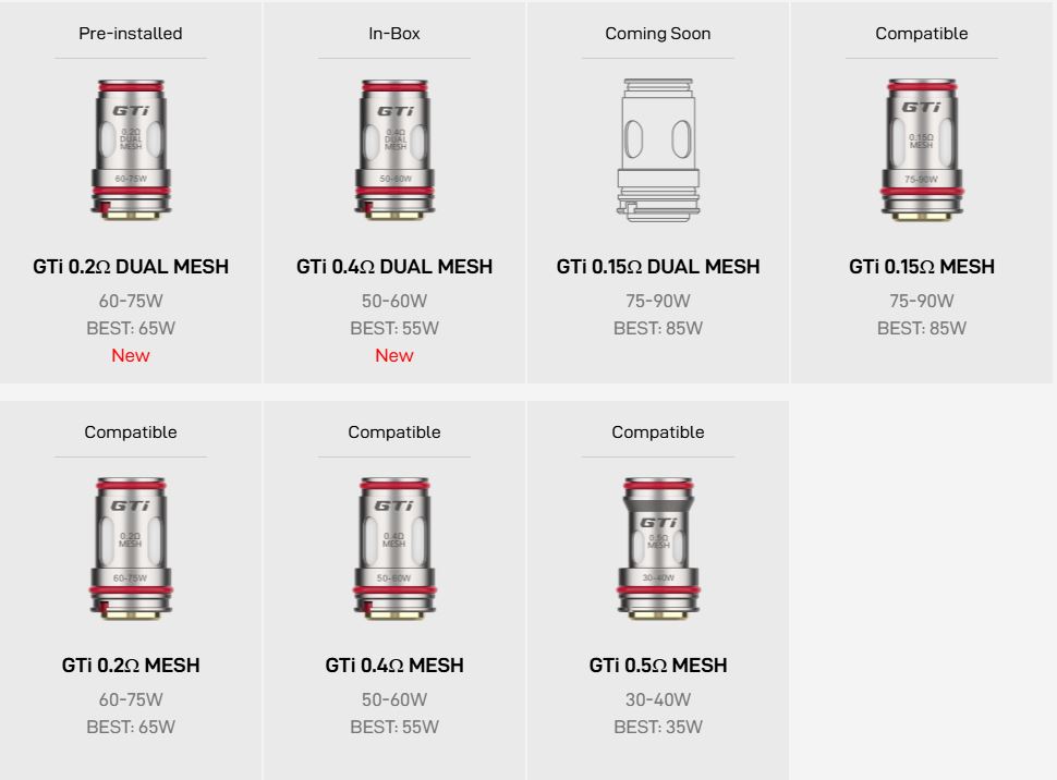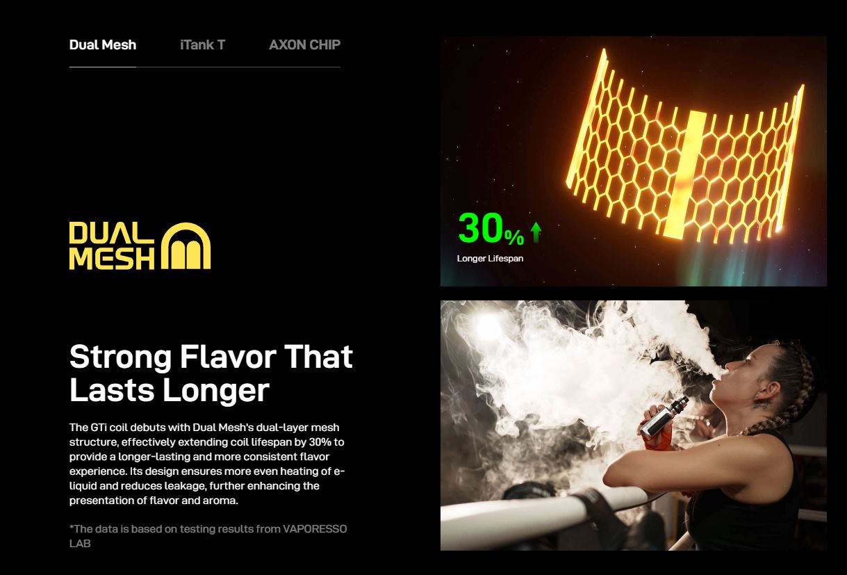 La nueva resistencia GTi se caracteriza por tener una estructura de malla de doble capa Dual Mesh, la cual prolonga su vida útil en un 30%. Su diseño garantiza un calentamiento más uniforme y reduce las posibles fugas de líquido.