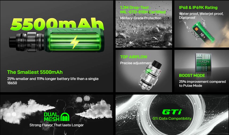 El kit Armour Ultra tiene una potente batería de 5500 mAh que dura casi como dos baterías de 18650, pero en un diseño compacto. Está pensado para resistir todo tipo de inconvenientes: agua, polvo y caídas, con certificaciones de nivel militar. Además, el modelo GTi incorpora una nueva tecnología de ventilación y un modo de refuerzo que mejoran su rendimiento.