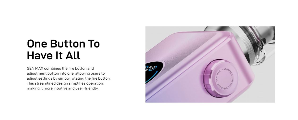 El dispositivo GEN MAX combina el botón de ajuste y el botón de disparo en uno mismo, lo que permite al usuario ajustar la configuración simplemente girándolo Esto hace que el diseño sea mucho más óptimo, simple e intuitivo.