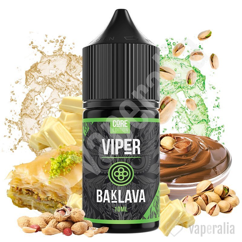 El aroma MiniLongfill Baklava de Viper Core Edition sabe a una equilibrada combinación de milhojas relleno de crema de avellanas, virutas de pistacho y cacahuete, rociado con chocolate blanco.