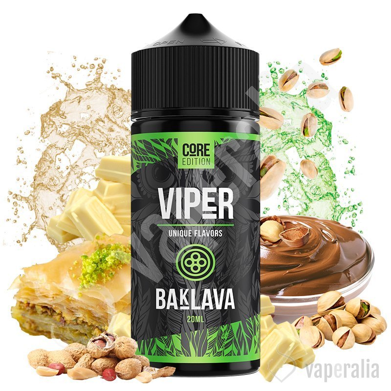 El aroma Baklava de Viper Core Edition sabe a una equilibrada combinación de milhojas relleno de crema de avellanas, virutas de pistacho y cacahuete, rociado con chocolate blanco.