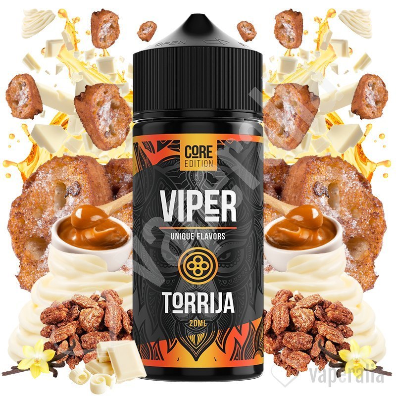 El aroma Torrija de Viper Core Edition sabe a una cremosa base de torrijas combinada con dulce de leche y chocolate blanco, con notas de vainilla y textura de nueces pecanas garrapiñadas, que elevan la experiencia de vapear al siguiente nivel.